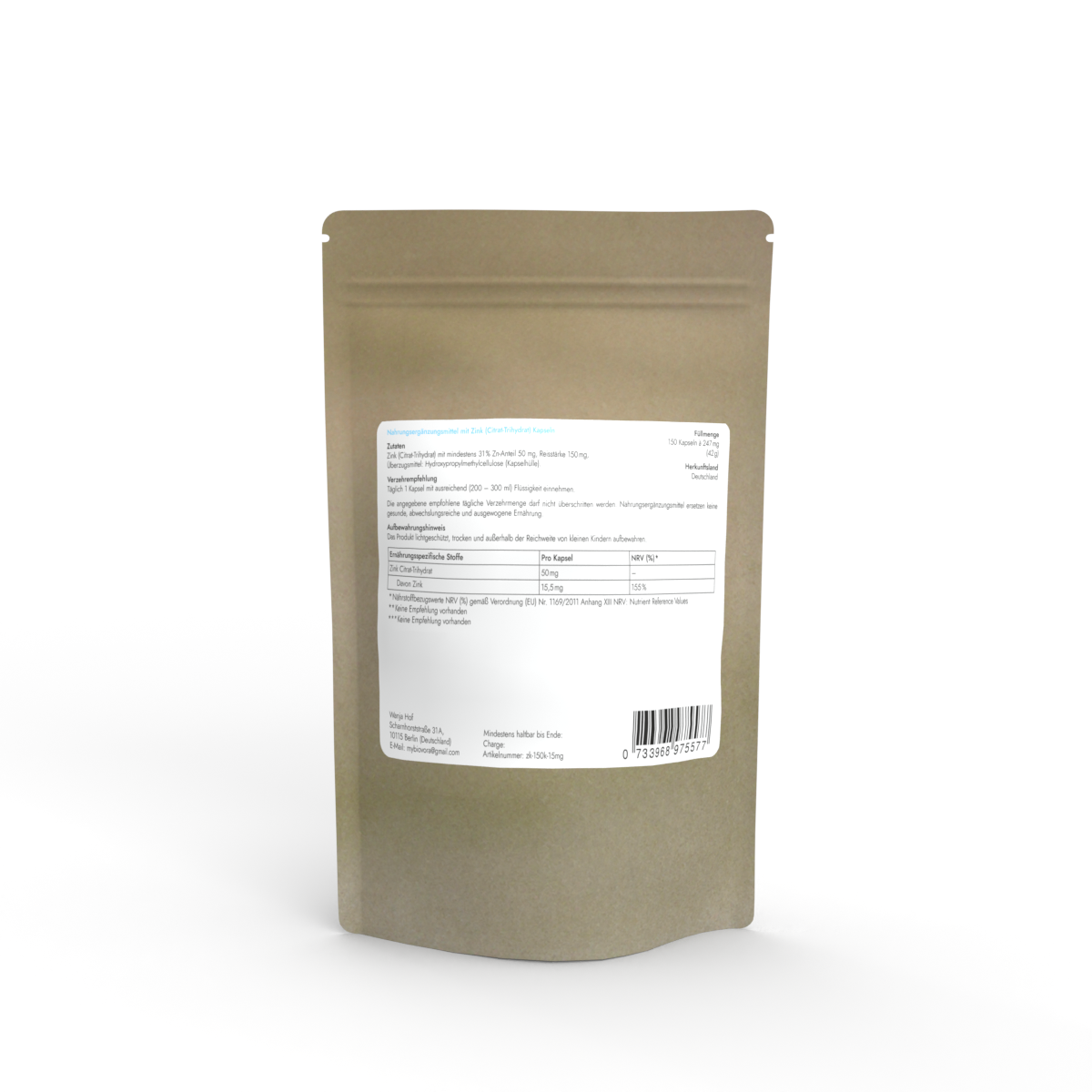 - 100% Zinkcitrat-Trihydrat mit einem Anteil von 31% reinem Zink (Zn)50 mg Zink Citrat-
